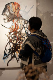 Na tela, o fio, o palito, direciona, abre caminho, possibilita o percurso. Obedece o ímpeto de vida dela, da tinta, da linha. Artérias, raízes, sustentam, refazem esse fio, vivo, que não para, que vai por entre, por tudo, e trama, a vida.
